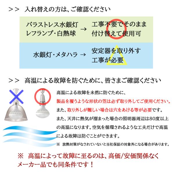 現在バラストレス水銀灯・レフランプ・白熱球使ってる場合→工事不要でLEDに付け替え可能
